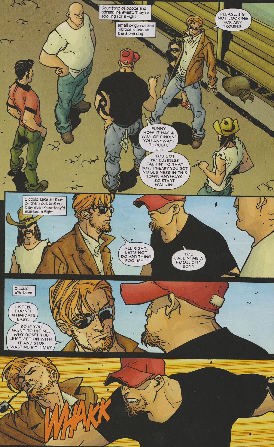 Matt Murdock sucht die Abgeschiedenheit und ist ziellos in der Wüste New Mexikos unterwegs. In einer Kleinstadt, durch die er zufällig kommt, wird er von ein paar unverbesserlichen Rednecks handgreiflich verjagt. In seiner momentanen Stimmung wäre Matt wohl seiner Wege gezogen, wäre da nicht der blinde Junge gewesen, der Murdock an sich selbst erinnert. Abgesehen davon, hat der Mann, der mal Daredevil war, sowieso das Gefühl, in dieser Stadt geht irgendetwas vor sich. Dazu braucht es nichterst den Sheriff, der ihn wegen Landstreicherei einbuchten will. Und Matt Murdock gerät mitten hinein in einen schwunghaften Waffenhandel, der auch vor Korruption nicht Halt macht.