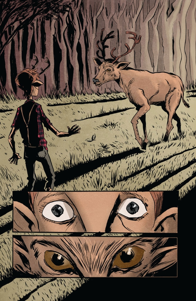 „Sweet Tooth – Aus dem tiefen Wald“ fesselt von der ersten Zeichnung an, wenn der Leser in die weit aufgerissenen Augen von Gus blickt und diese starren ängstlich und verwirrt zurück. Das Close-up als Opener. Der Establishing Shot zeigt keine Totale, sondern dringt vor in den Bereich, den es zu ergründen gilt: Die Seele des einsamen Outsiders. Das wovon Gus träumt, dieses unbekannte Gesicht, ist Bedrohung, unentrinnbare Bedrohung. Und schweißgebadet wacht der Junge aus der Flucht auf.