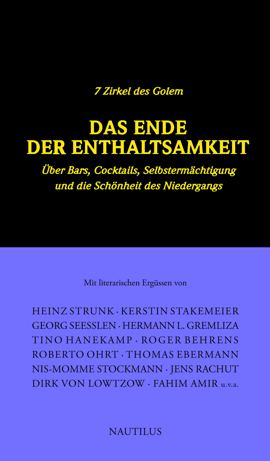 Der Trunksüchtige ist um schöngeistige Rechtfertigung seines delirierenden Treibens nie verlegen. Der Hang zum Rausch braucht nicht nur eine Verortung, wie im Falle der Golem Bar in Hamburg, sondern auch ein metaphysisches Konzept. Den braven Bürger und den nüchternen Betrachter wird auch das nicht beeindrucken. Das Unwirtschaftliche, Ineffiziente, gar Asoziale der Sauferei liegt auf der Hand – oder kreucht durch die Gosse. Die Betreiber des Golem haben nun einen kleinen, aber feinen Sammelband in edles Linnen gepresst und auf die „Weltstadt“ und das Weltenrund losgelassen, der sich mit der Selbstermächtigung und der Schönheit des Niedergangs befasst.