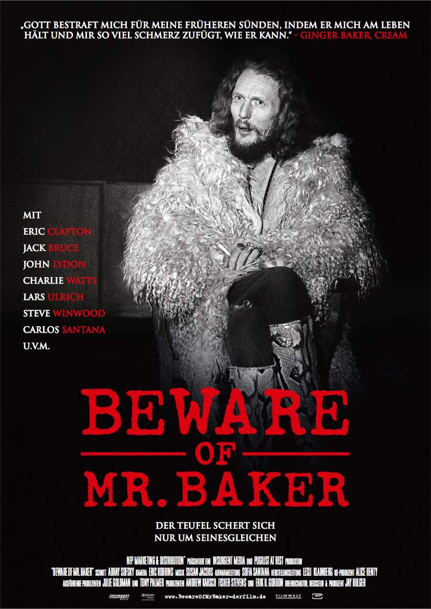Und daher kriegt der Journalist, Ex-Boxer und Filmmacher Jay Bulger zu Beginn der Doku „Beware of Mr. Baker“ erstmal eins mit dem Gehstock auf die Nase. Eigentlich passiert das erst nach den Interviews mit Ginger Baker in dessen südafrikanischer Wahlheimat. Aber als Eingangsszene für eine höchst unterhaltsame und richtig kompetente Doku ist das selbstredend ein großartiger Opener. Entzündet hatte sich Bakers Unmut, als Bulger eröffnete, er würde auch noch andere Musiker für den Film interviewen. Und weil Baker die alle nicht in „seinem“ Film haben wollte, hat er eben zugelangt.