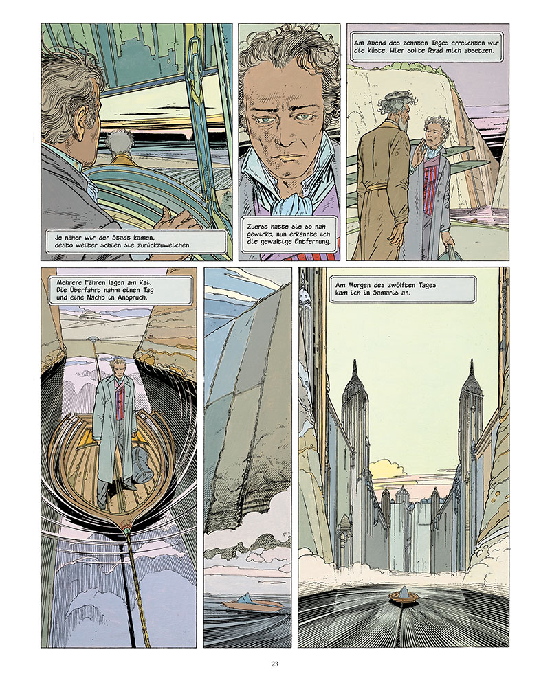 Mit „Die Mauern von Samaris“ begibt sich das kreative Gespann Schuiten und Peeters erstmals in diese mysteriöse Parallelwelt der geheimnisvollen Städte. Die Welt ist unserer in manchen Belangen ähnlich. Hier setzen sie den erzählerischen und zeichnerischen Rahmen dessen fest, was sich über etliche Alben und in loser, abgeschlossener Folge als ein Meilenstein französischsprachiger Comic-Kunst erweisen sollte.