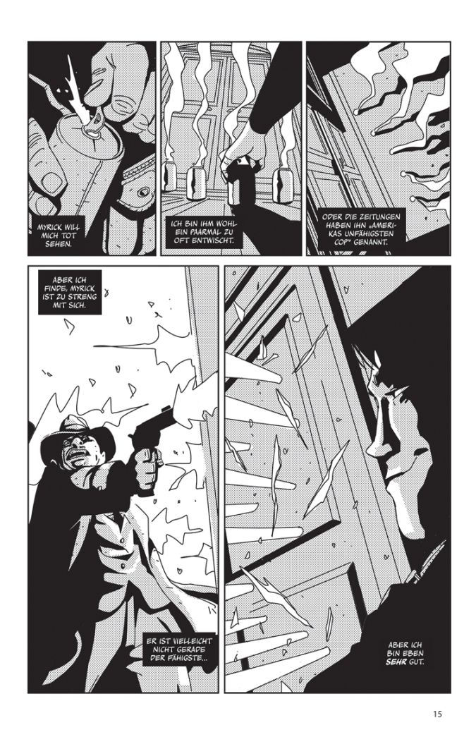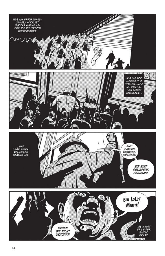 Stilistisch erinnert „Silver“ vor allem wegen des intensiven Einsatzes großer Schattenflächen, auch aber wegen des zeitlichen Settings, ein bisschen an Mike Mignolas „Hellboy“. Allerdings tauchen im Auftaktband kaum übernatürliche Wesen auftauchen. Das wird sich in der weiteren Erzählung sicher deutlich ändern. Ie Charaktere sind allesamt gut ausgearbeitet und mysteriös gehalten. Wir bleiben gespannt. Und gehen mal davon aus, dass mit fortlaufender Erzählung auch die gelegentlich etwas hölzernen Dialoge an Pepp gewinnen.