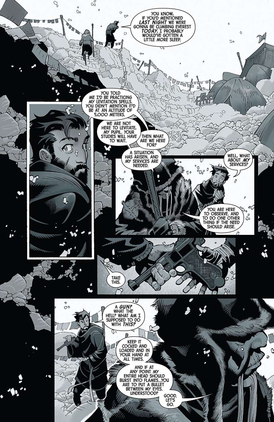 Autor Jason Aaron macht vor wirklich gar nichts halt. Es scheint beinahe so, als wäre seine ehrfurchtslose Sturm und Drang-Phase noch immer nicht vorbei. Mit welcher Selbstverständlichkeit Aaron sich an die großen Feinde von Doctor Strange heranwagt, ist schon mehr als beeindruckend. Fast in jedem Heft kommt ein weiterer Erzfeind an die Reihe und will seine Kräfte mit dem Obersten Magier messen. „Baron Mardo“, „Nightmare“ und „Satana“ geben sich hier die Klinke in die Hand. Und der kann sich erstaunlicher Weise immer wieder behaupten oder zumindest den Kopf aus der Schlinge ziehen. Okay, Bibliothekarin Stanton und Hausdiener Wong helfen kräftig mit.