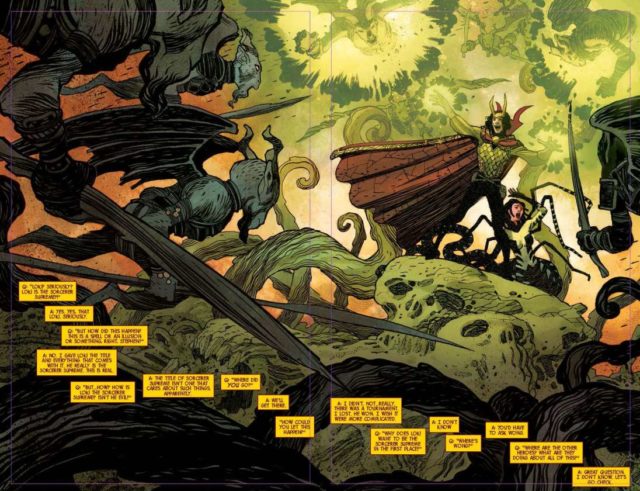 Auch die Optik ist nicht so ganz mein Fall und so sehr es inhaltlich stimmig ist, dem Doc eine neue Optik mit Vollbart und Kurzhaarfrisur zu verpassen, so irritierende ist das auch für den Leser. Es ist keinesfalls so, dass dem Artwork von Gabriel Hernandez Walta der Drive fehlen würde. Die düster gehaltene Farbgebung von Jordie Bellaire ist ebenfalls durchaus stimmig für dieses Abenteuer. Dennoch will sich nicht so recht jene Begeisterung einstellen, die die letzten Ausgaben von „Doctor Strange“ versprühten.