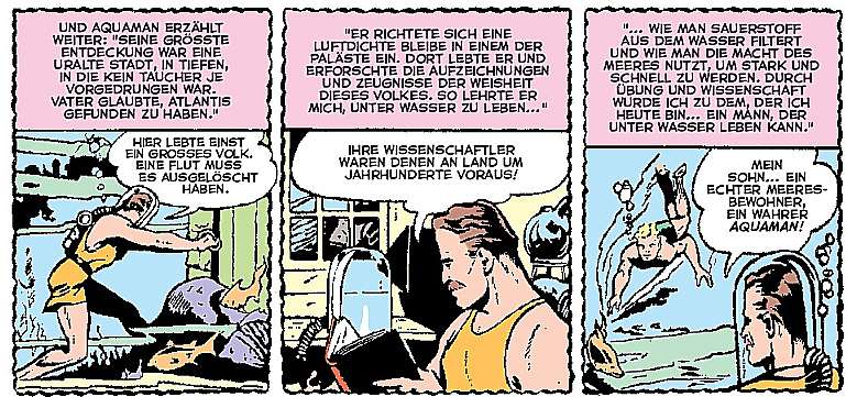 Doch die Lesergunst ist selten über Jahrzehnte konstant und ab den späten 1960er Jahren verloren auch Aquaman und seine fantastische Unterwasserwelt Atlantis an Beliebtheit. Als Mitglied der „Justice League“ überlebte der atlantische Held aber etliche Höhen und Tiefen. Es ist durchaus plausibel, dass mit Erforschung des Weltraums auch die Faszination der unerforschten Tiefsee nachgelassen hat, wie das in einem der kenntnisreichen Begleittexte zu lesen ist.