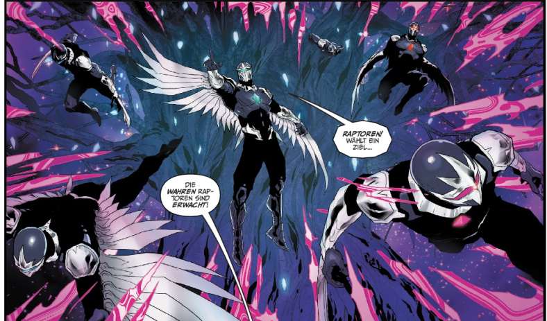 Also auf ins Geschehen diesem Megabands mit dem Titel: „Die Macht von Thanos“. Jener durchgeknallte kosmische Bösewicht taucht in den neun US-Ausgaben des Megabandes auch nur in einer Szene auf, in der er gelangweilt in seinem Thron sitzt. Das allein wäre noch kein Manko für die Geschichten, aber so richtig hervortun kann sich keine der fünf unterschiedlichen Stories. Dabei nimmt die Geschichte von Darkhawk, der über vier US-Ausgaben versucht die bösartigen Raptoren aus unserer Dimension fernzuhalten den Hauptteil des Megabandes ein. Die Story von Chad Bowers und Chris Sims hat so ihre Momente, ist aber letztlich in ihrer kosmischen Ausrichtung ein wenig austauschbar.