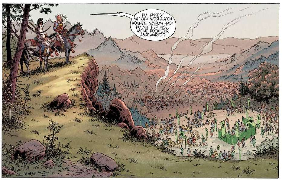 Der zweite Band der historischen Graphic Novel ist deutlich Action-Lastiger als der Vorgänger. Dennoch sind die historische Umgebung und die Szenen erneut sehr detailiert ausgefallen und stilistisch lässt sich gerade in der Farbgebung und im Bildaufbau wieder eine Nahe zu historischen japanischen Malereinen entdecken. Auch der „Göttliche Spiegel“, um den es hier geht stammt aus einer alten japanischen Sage.