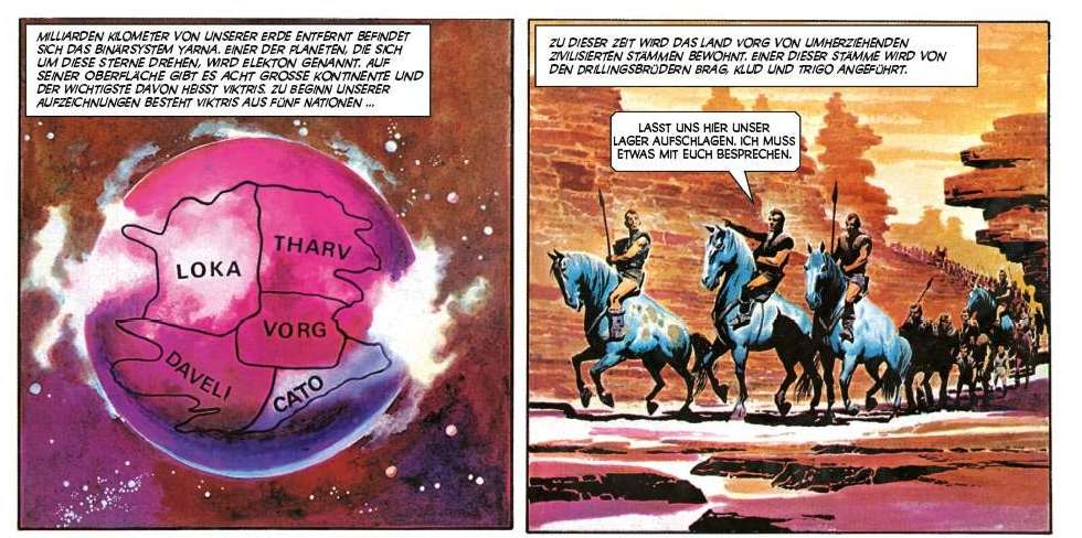 Die Story und ihre Elemente sind aus heutiger Sicht sicherlich ein wenig geschichtslastig ausgefallen und durch die Art der Erzählung etwas zu belehrend. Seinerzeit allerdings war die allwissende gelegentlich altkluge Erzählerperspektive durchaus gängig und die Action-Sequenzen versteckten sich stark in der Handlung. Beim kultigen „Prinz Eisenherz“ von Hal Foster wechseln länge Textpassagen mit eher statischen Zeichnungen, bei „Karl“ und auch bei „Trigan“ wird immerhin schon grafisch erzählt, auch wenn der Textanteil noch erheblich erläuternd ist.