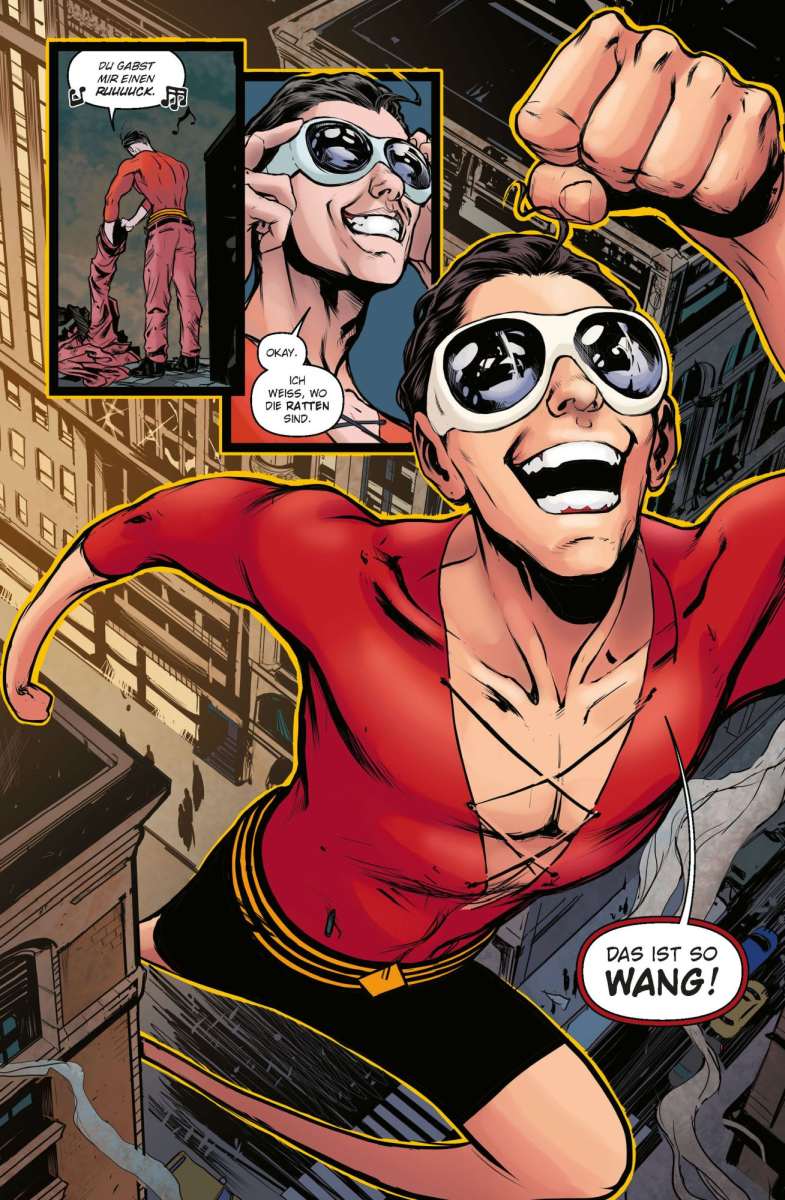 Knackig an der ganzen Chose ist weder das zeitlose Setting, dass irgendwie Referenzen an die großen Gauner- und Mafia-Zeiten aufleben lässt und zugleich ziemlich modern wirkt, noch das Superhelden-Abenteuer an sich. Fluffig ist der Humor bei der Sache. Nicht eben selten wandelt der Super-Aal auf Transvestiten-Spuren, manifestiert sich als „Wonder-Woman“ oder als Riesen-Pony im Feen-Style. Der Kollege „Plastic Man“ kriecht in jede Ritze und hat vor nichts Respekt.