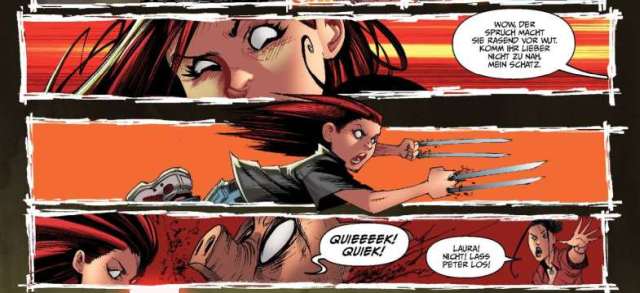 Den Auftakt macht „Weapon Hexx“, der Warp von Scarlet Witch und Laura alias Weapon X. Die Story über zwei US-Ausgaben ist ziemlich undramatisch aufgebaut und reißt einen nicht wirklich vom Hocker. Das Artwork immerhin wirkt kanckig, frisch und jung, etwa so wie das auch in dem „Teen Titans“-Megaband ist, den ich hier vor einigen Monaten vorgestellt habe.