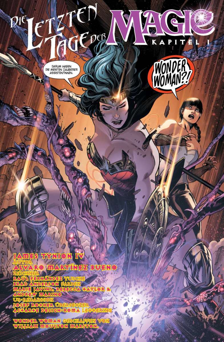 Das Problem, dem sich die neue Truppe gegenüber sieht, ist beträchtlich. Irgendjemand hat eine Macht aus einer anderen Dimension freigesetzt, die Magie (und Magier) frisst – der Kopfüber scheint unbesiegbar. Doch kann ausgerechnet Wonder Woman ihn vorerst stoppen. Fragt sich woher Wonder Woman verborgene magische Kräfte hat?