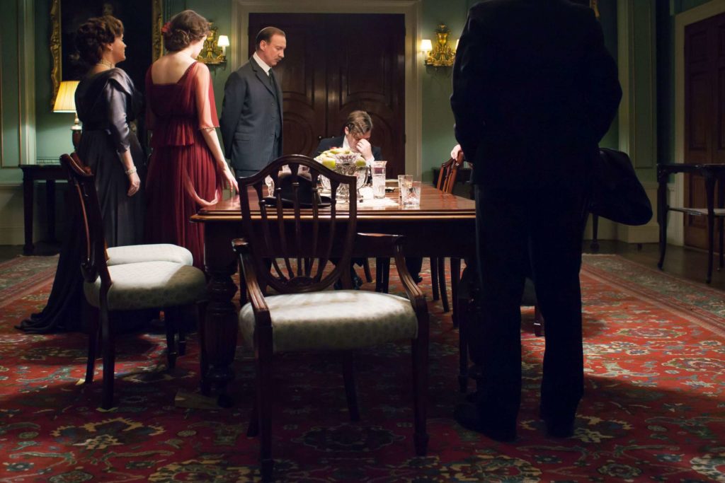 Regisseurin Aisling Walsh, die mit ihrer hinreißenden Künstlerbiographie „Maudie“ (2016) den Sprung von Fernsehen auf die große Leinwand schaffte, bleibt in ihrer Inszenierung von „An Inspector Calls“ dem Vorbild sehr treu. Zwar gibt es, eingebettet in die jeweilige Befragung, auch immer bebilderte wohl ausgestattete Ausflüge in Evas Leben, also ein Verlassen des herrschaftlichen Esszimmers, in dem jene Befragung stattfindet, aber im Wesentlichen hält sich der Geist jener „Bretter die die Welt bedeuten“ ziemlich stark. Man kann das als Qualität sehen, oder etwas steif finden.