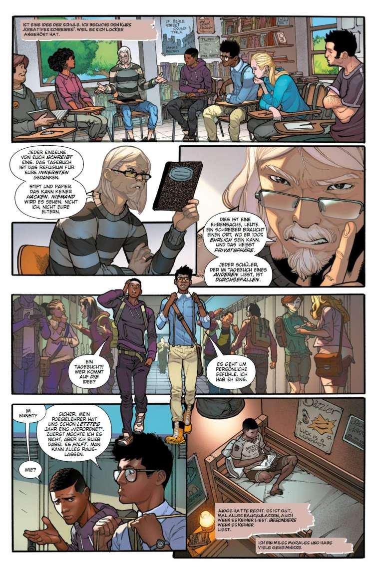 Zunächst fremdelt Miles Morales noch mit den Niederschreiben seiner Gedanken und Gefühle, aber sein Stubenkollege Judge schreibt selbst schon länger Tagebuch und erklärt, das sei cool. Sandkasten-Buddy Ganke weiß ohnehin, dass Miles Spider-Man ist. Also warum nicht einen Versuch wagen?