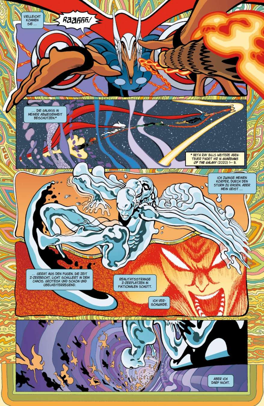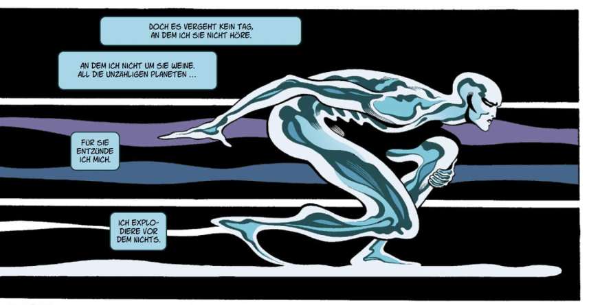 Im Gegenteil: So frisch hat man die tiefgründige Gestalt des Surfers lange nicht mehr gesehen. Sicher, das Requiem war auch großartig und der letzte Surfer-Megaband von Dan Slott und den Allreds hatte auch seine Momente vor allem in dem Artwork, das an Pop-Art erinnerte. Tradd Moore (Zeichnungen) und Dave Stewart (Farben) gehen aber noch einen Schritt weiter. Sie lassen die bunte Pop-Art hinter sich, um wieder in einer psychedelischen Farborgie zu enden, über die sich die Grateful Dead ebenso gefreut hätten, wie Jack Kirby seinerzeit.