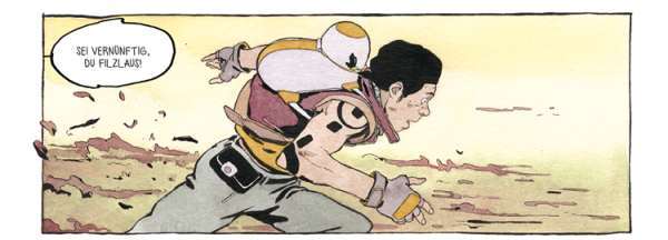 Merwans Aquarelltechnik sorgt im vorliegenden Werk für sehr organische, natürliche Farben, die den überwucherten Zivilisationsruinen eine unscharfe, verwunschene und gefährliche Anmutung verleihen. Seitenaufbau und Panel-Anordnung sind meistens eher klassisch gehalten, was dem Lesefluss dient, aber auch für zusätzliche formale Dynamik sorgt, sobald das Schema einmal aufgebrochen wird. Und dann ist da noch die phänomenale Splashpage gegen Ende, die angemessen wuchtig rüberkommt und die allein „Mechanica Caelestium“ in einem popkulturellen Olymp befördert. Mehr WOW geht kaum.