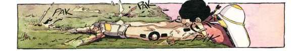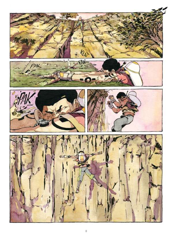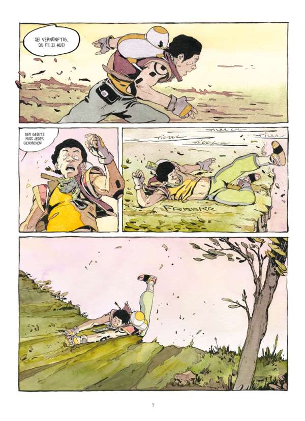 Soundeffekte nennt man im Comic jene (meist quietschbunten) „Zack, Puff, Päng“-Schriften in den Panels. Comic-Leser kennen das. Hier aber hörte ich auf den ersten Seiten eine Machete durchs Unterholz fahren, eine abrupte Bremsung auf dem Hosenboden und das vereinzelte, sich entfernende Fallen eines Steins. Dann Magengrummeln, Kaugeräusche und Schlucken mit denen ich tatsächlich etwas anfangen kann, und die eben nicht einfach in die Panels gepfuscht sind, weil es bis dahin so wenig Dialog gibt. Vielleicht gelingt es dem einen oder der anderen darauf zu achten, obwohl Merwans Seiten wirklich durchgehend spektakulär illustriert sind.