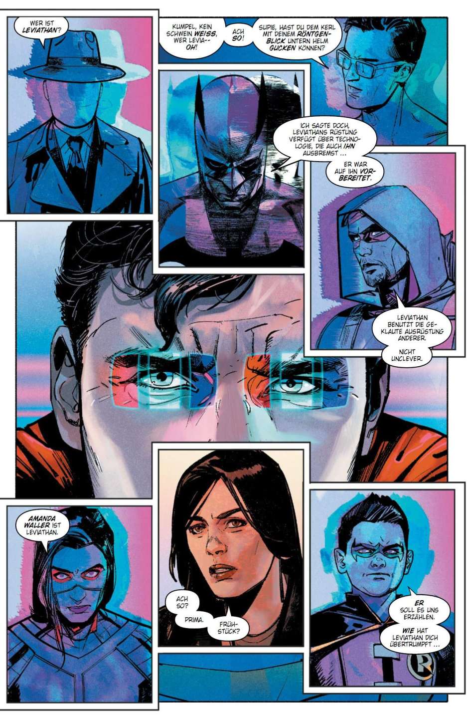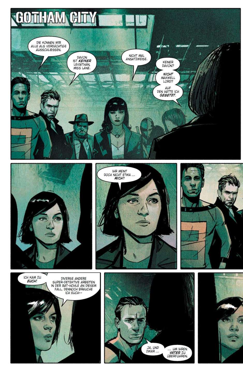 Supermans Auftauchen gibt Batmans Detektivgruppe noch einmal eine andere Dynamik und einige Mitglieder fühlen sich in die zweite Reihe versetzt. Doch langsam wird klar, was Leviathan im Schilde führt. Das gefällt auch Thalia al Ghul nicht, die den Detektiven ihre Hilfe anbietet. Eine zweifelhafte Offerte.