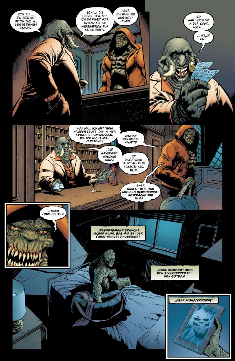 Wir befinden uns im DC-Superhelden-Universum zeitlich nachdem Leviathan die Geheimdienste vernichtet hat („Leviathan-Event“) und mitten in dem Batman-Event „Bane City“, als in einem Stadtteil von Gotham, der sich völlig zu Recht „Monstertown“ nennt, ein frisch aus dem Knast entlassener Killer Croc einen rechtschaffenen Job suchen will.