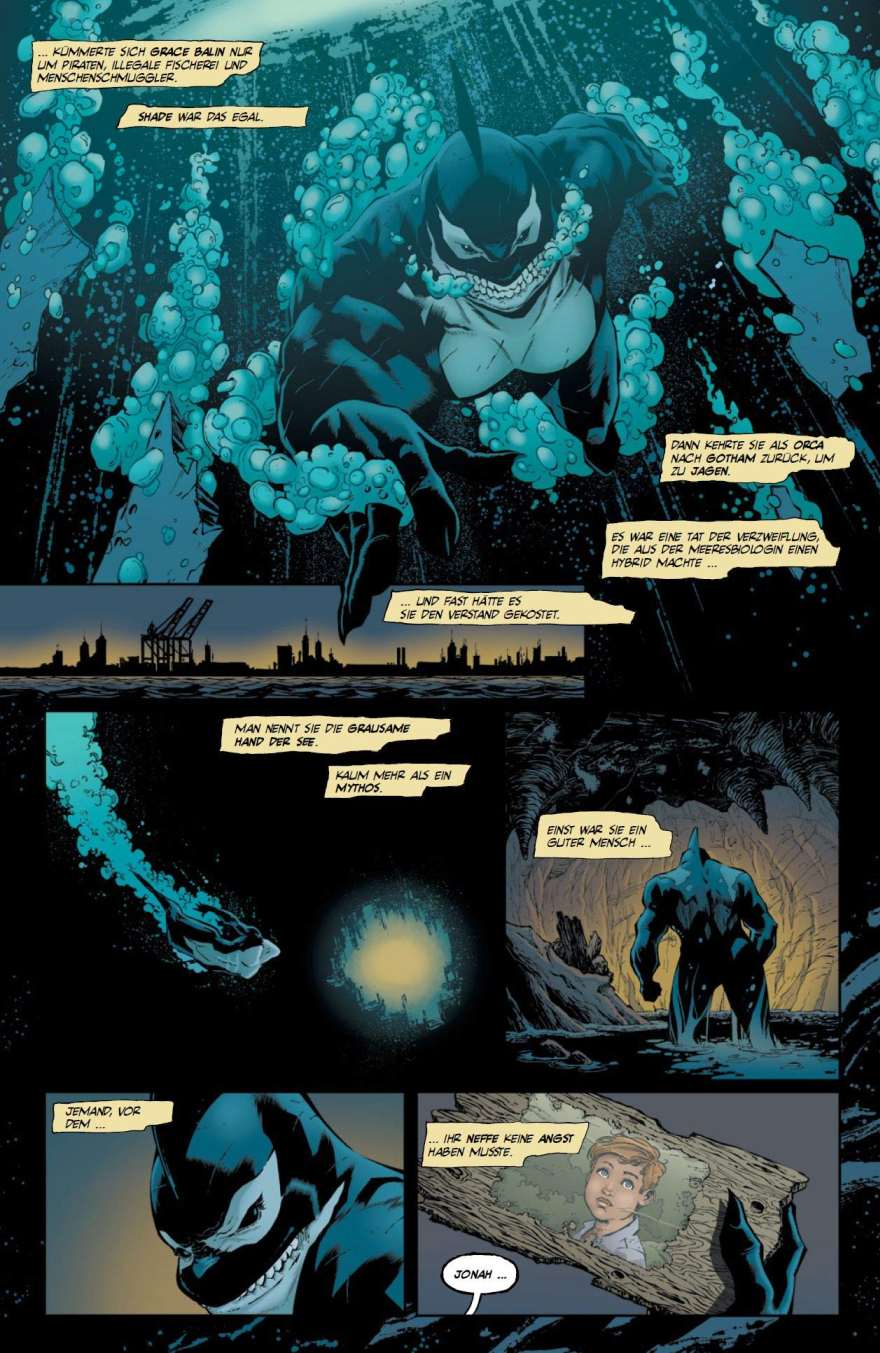 Stilistisch ist das Artwork auf ähnlich austauschbarem Niveau. Die Hintergründe sind zwar allesamt düster und lichtscheu, aber abgesehen vom stimmungsvollen Auftakt, geht das Gruseln spätestens bei der Team-Bildung flöten. Killer Crocs Intro ist stark und Bennetts Kampf mit den Mönchen sieht auch mehr als solide aus. Aber wer auch immer sich das Charakterdesign von Orca überlegt hat, hat es gründlich verbockt, selbst wenn die mutierte Walfrau mal menschlich war, einen Busen braucht die aufrecht gehende Mutation definitiv nicht und es sieht einfach dämlich aus. Nu je, das Artwork hat auch schöne Momente, aber die Story reißt es letztlich nicht raus.