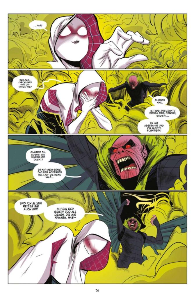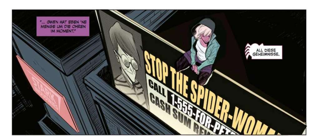 Die Action ist sehr dynamisch und kommt mit Soundeffekten ebenso gut rüber wie mit „Zeitlupen“-Panels und Close-ups. Selten braucht‘s in „Spider-Gwen“ tatsächlich diese Bewegung begleitenden Schnelligkeitsschraffuren. Die Arbeit von Kolorist Rico Renzi sollte man in dem Zusammenhang nicht unterschätzen, denn seine Farbgebung sorgt ebenfalls für ein starkes grafisches Konzept. Licht und Dunkelheit werden sehr akzentuiert eingesetzt und gerade die das Spider-Gwen-Kostüm mit der Hoodie-Kapuze ist immer wieder überraschend anzuschauen. Zu all dem kommt auch noch ein sehr variabler Seitenaufbau und ein offenes Panel-Muster.