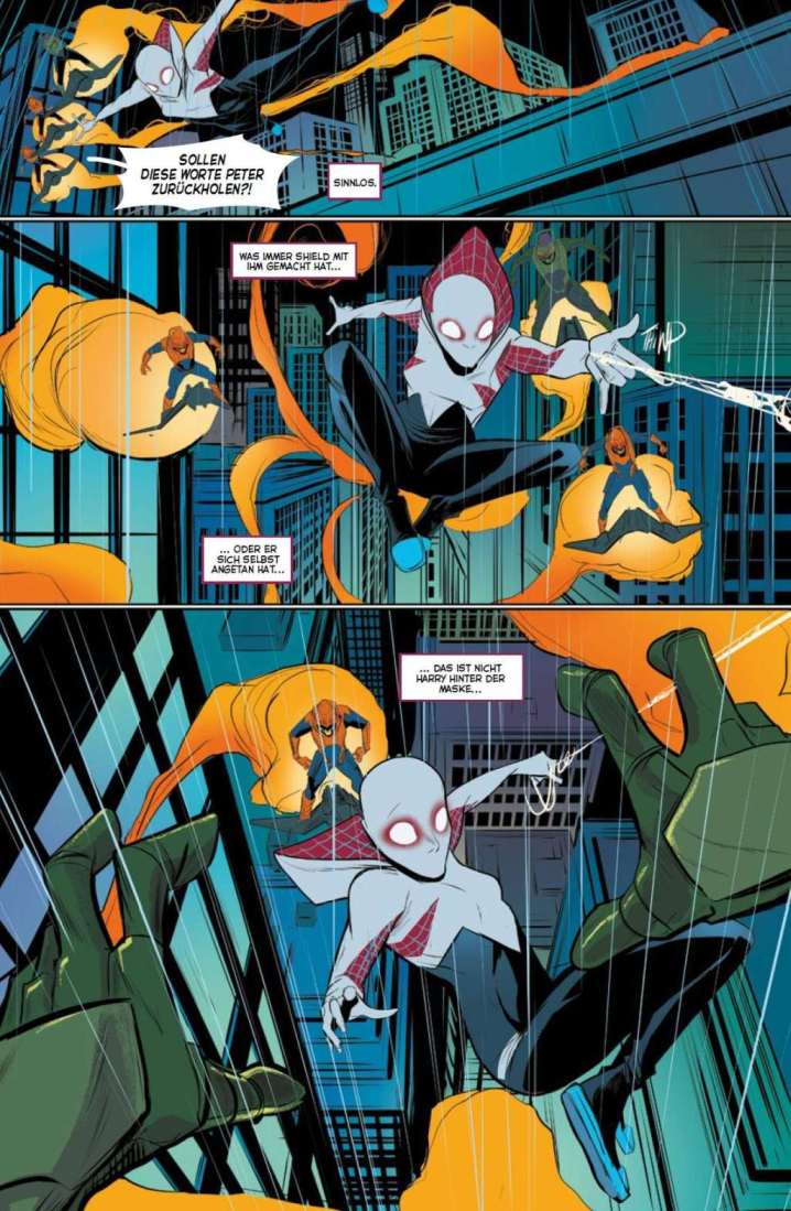 Gwen kriegt derweil ihr Privatleben kaum auf die Reihe. Vor allem die Band, in der sie Schlagzeug spielt, wird zunehmend sauer, dass Gwen nicht zu den Proben erscheint. Denn die „Mary Janes“ wollen jetzt durchstarten und haben einen wichtigen Gig vor der Nase. Doch dann taucht ein Superschurke namens „Geier“ auf und legt sich mit „Spider-Gwen“ an.