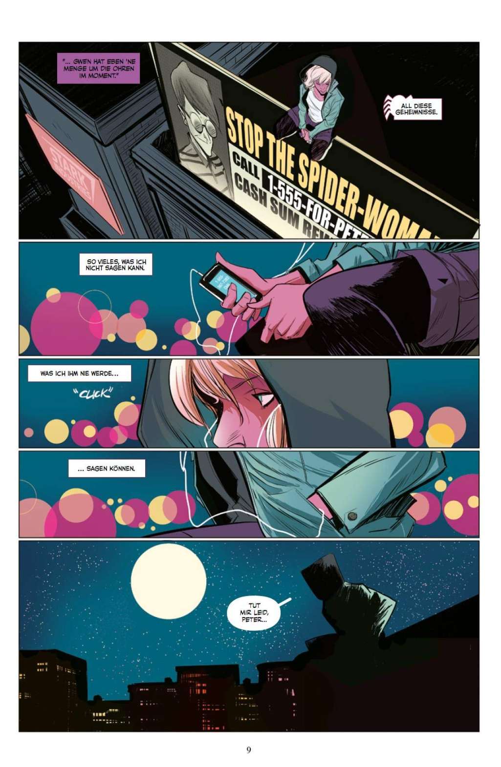 Gwen leidet unter ihrer Geheimidentität und würde sich gerne ihrem Vater offenbaren, denn sie könnte der Polizei helfen. Doch der hat ganz andere Sorgen. Weil er „Spider-Woman“ nicht zu fassen bekommt, übernimmt Detective Frank Castle die Suche und rückt Gwen gefährlich nahe. Matt Murdock, seines Zeichens der Anwalt des Unterweltbosses Kingpin hat so seine eigene Theorie, was die Identität von „Spider-Woman“ angeht, doch das tut wenig zur Sache, denn die Heldin kommt den Aktivitäten seines Bosses zu nahe.