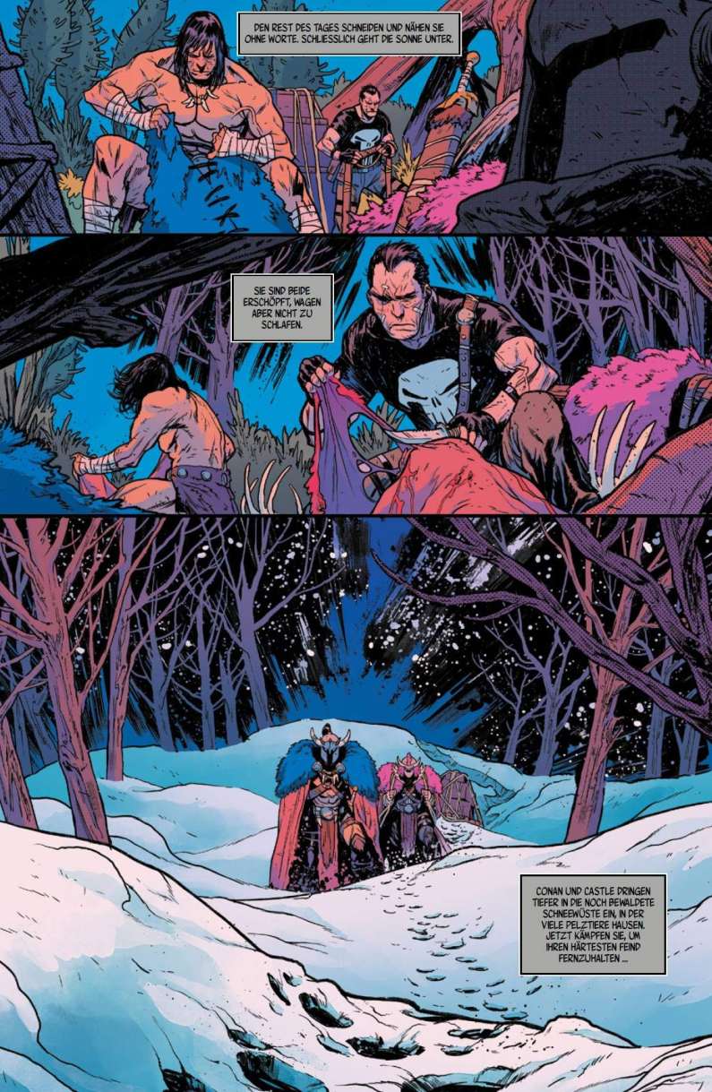 Während sich der Rest des Teams mittels moderner Verkehrsmittel wieder nach Hause begibt, sind Conan und Frank ‚Castle zu Fuß unterwegs. Das liegt daran, dass der Punischer die sterblichen Überreste seiner Familie wieder nach Hause schaffen will. Also geht es zunächst durch die Arktis um dann per Schiff nach Südamerika zu reisen. Dort trennen sich die Wege der beiden.
