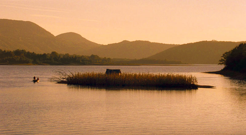 Der alte Bauer Abga (Ilyas Salman) stakt mit seinem Boot zu einer dieser Inseln und markiert sie mit einem weißen Tuch. Dann errichtet er aus schlichten Baumaterialien vom Ufern eine einfache Hütte auf der Insel. Nachdem der Boden vorbereitet ist, bekommt der Alte Hilfe von seiner jungen Enkelin Asida (Mariam Buturishvili). Er bringt ihr bei wie man fischt und wie man den Mais bearbeitet.