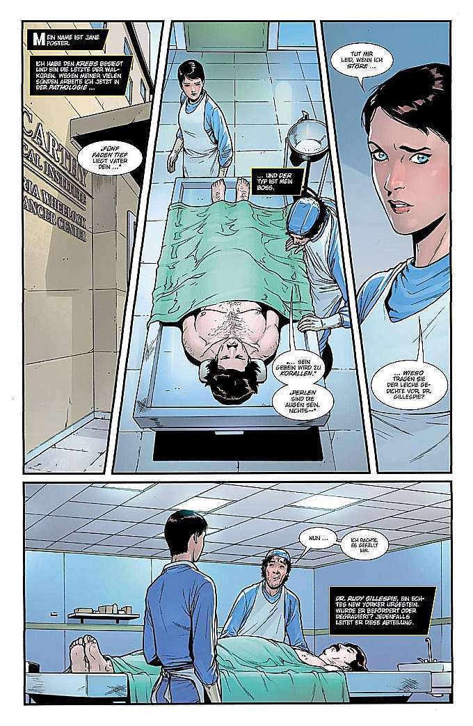 Es braucht ein wenig, bis sich bei der Geschichte, die zwei US-Ausgaben umspannt, so etwas wie Spannung einstellen will. Hanes Geheimidentität steht in der Pathologie ebenso auf dem Prüfstandwie ihre Eignung als Medizinerin. Sie sucht sich Verbündete, aber der Serie geht mit dem Team-up auch ein wenig die eigene Identität flöten. Oder vielleicht ist es auch ein weiblicherer, modernerer Superhelden-Weg, Verantwortung und Herausforderung zu teilen. Die Geschichte von Aaron und Al Ewing hat ebenso ihre Momente wie das Artwork von Pere Perez. Das besticht nicht durch sonderliche Dynamik, hat aber ein gutes Gespür für „Massenszenen“ und Blicklenkung der Leser.