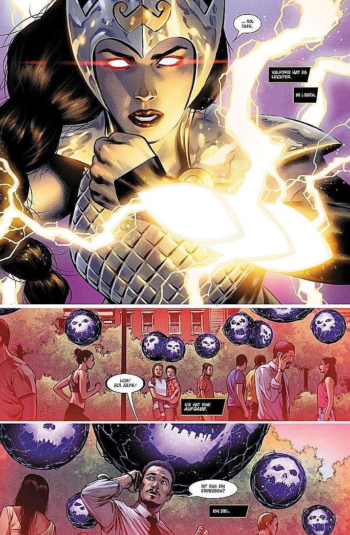 Heldin Valkyrie ist in Marvels Superhelden-Universum nicht neu. Brunhilde verband sich seinerzeit mit der irdischen Anabella Riggs zu Valkyrie.Die spielte auch in der rein weiblichen „Defenders“-Inkarnation (2013-14) eine Hauptrolle. Jane ist allerdings eher eine Art „Ideal-Walküre“ geworden, da mit Brunhilde die letzte der Walküren jüngst verstarb.