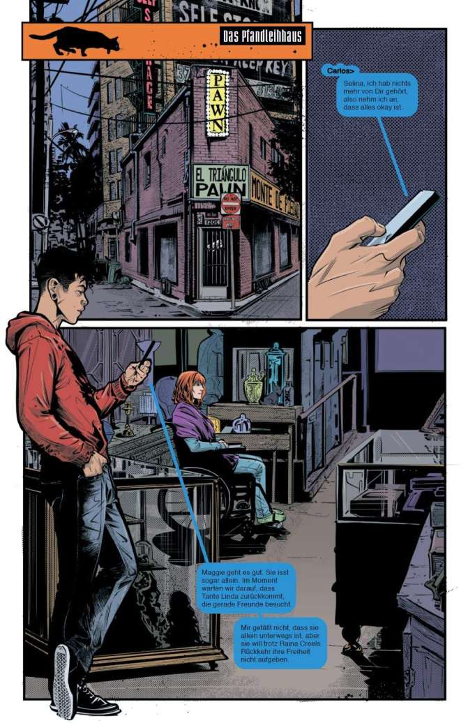 Nun aber zurück zu „Catwoman“: Nachdem Selina Kykle ihre Vermählujng mit Bruce Wayne hat platzen lassen, brauchte sie einen Ortswechsel und ist ins kalifornische Villa Hermosa gezogen. Dort wohnt sie über einer Pfandleihe mit ihrer Schwester Maggie zusammen, die gerade eine katatonische Phase hat und im Rollstuhl sitzt. Die Pflege von Maggie übernehmen Carlos und seine Tante Linda, die auch die Pfandleihe betreiben, über der Selina wohnt.