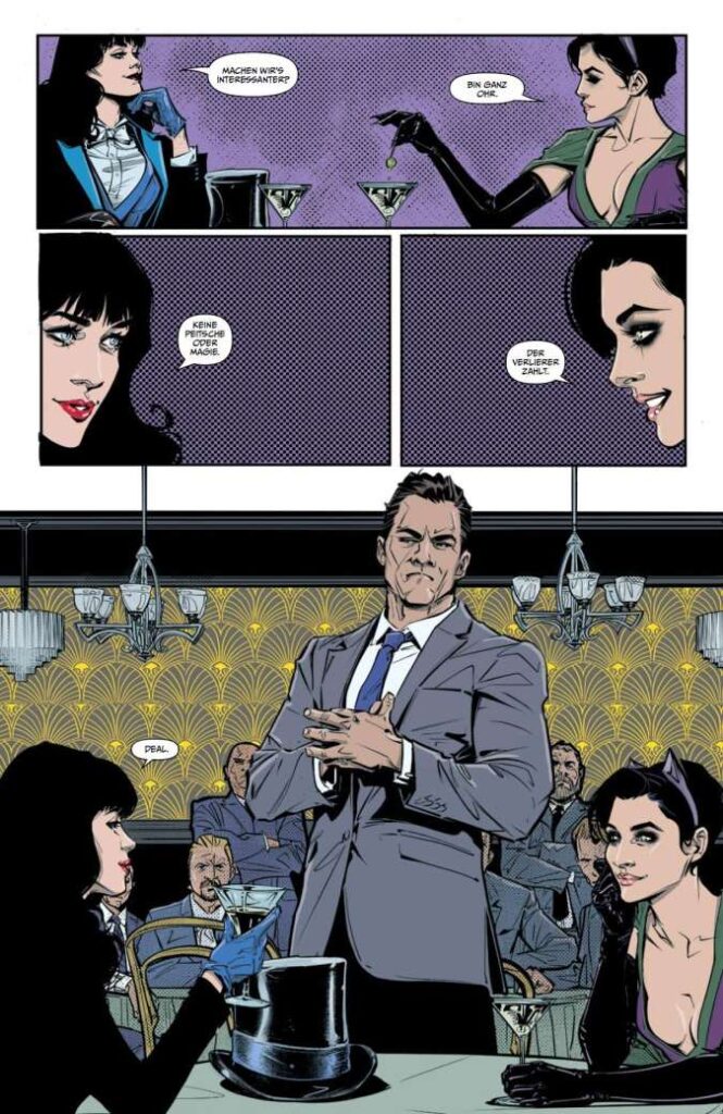 Ich habe eingangs erwähnt, das Joelle Jones auch wieder selbst Bleistift und Pinsel anlegt, das ist immer eine große Freude und ein visueller Genuss, sofern Leser:innen diesen Stil mögen. Aber insgesamt ist das Artwork in „Die Masken der Katze“ recht unterschiedlich ausgefallen. Wohlgemerkt nicht der Erzählfluss oder das Panelling, sondern die Illustrationen an sich. Während Jones vor allem die erzählerischen Auftakte der Geschichte und den Rahmen des Zusammentreffen mit Hexerin Zatana illustriert, ist Fernando Branca für die Action in der Saloon-Schlägerei zuständig und später für die Festivitäten im Ballsaal. Das ist großteils gefällig anzusehen und von Laura Allred, die fast überall für die gelungenen, stimmungsvollen Farben sorgt schillernd umgesetzt.