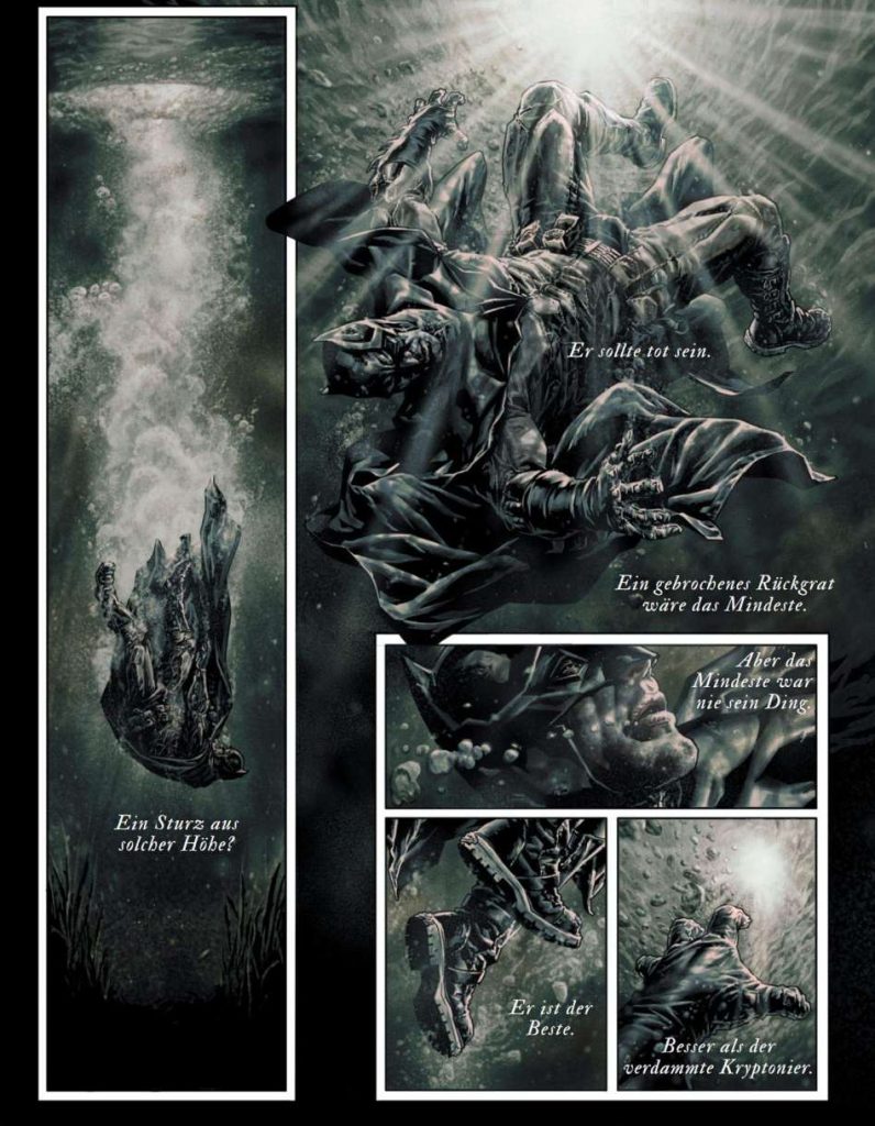 Die Szene auf dem Friedhof, in der Swamp Thing den Batman wieder unter der Erde hervorholt, zeigt wie sehr die Künstler dem Medium Comic und der bebilderten Detektive-Geschichte verbunden sind: Wenn das keine selbstbewusste Hommage an Will Eisners „Der Spirit“ ist, wie Constantine – mit Augenbinde – rauchend auf dem Grabstein hockt, weiß ich es auch nicht. Aber das ist nur eine Randnotiz.