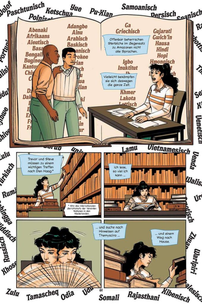 Weil Diana in „Stürmische Zeiten“ noch eine Jugendliche ist, wird aus Steve Trevor, mit dem Diana sonst auch schon mal eine Beziehung hatte, ein doppelter onkelhafter Mentor, der jeweils auch einen unterschiedlichen Migrationshintergrund hat. Mir persönlich ist es an der Stelle dann doch zu politisch korrekt und zu amerikanisch. In den USA gehen gesellschaftliche Debatten um solche Feinheiten. Nun denn, eine Sensibilisierung für Diversität in der Gesellschaft im Sinne der Comedy-Serie „Modern Family“ kann ja nie schaden.