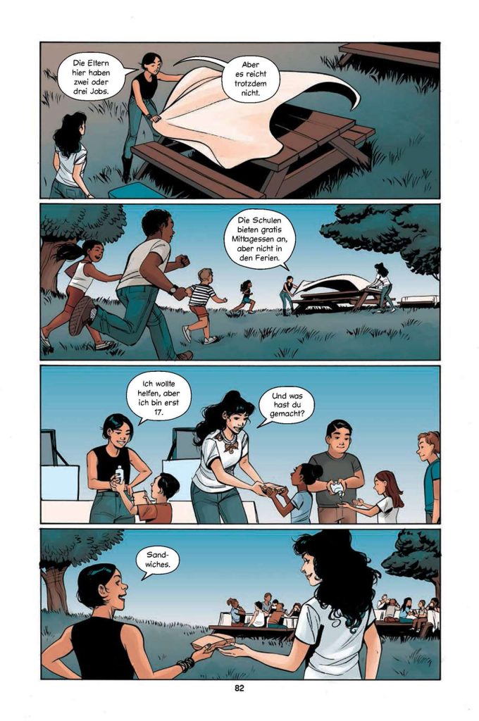 Insgesamt ist die Ausrichtung der Geschichte auf gesellschaftliche Probleme wie Flüchtlinge, Gewalt gegen Frauen und Kindesmissbrauch schon deutlich aber eben auch kindgerecht aufbereitet. So richtig cool ist Wonder Woman noch nicht, längst keine Superheldin, hat ihre Kräfte noch nicht gefunden und entfaltet, aber diese Entwicklungsgeschichte, das Coming of Age, ist eine gute Geschichte und ein Pfeiler der Jugendliteratur. Das Artwork ist solide und zielgruppengerecht. Das gilt sowohl für Zeichnungen wie Farbgebung. Superhelden-Action suchen Leser:innen auf diesen Seien indes vergeblich. Aber das ist auch beabsichtigt.