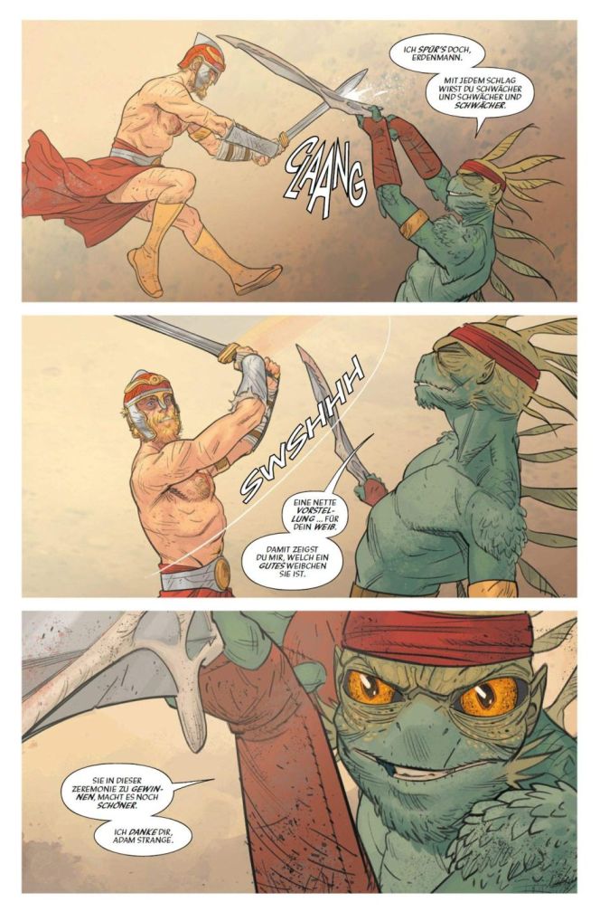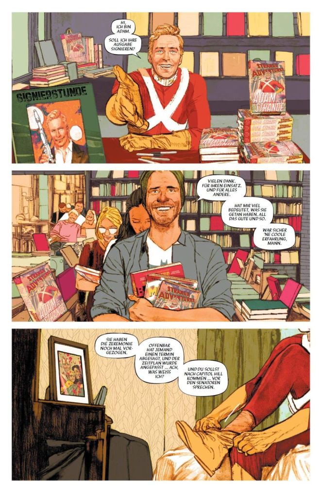 Viel Handlung und viel Vorlauf für eine herausragende Comic-Serie. eine Serie, die es schafft, mit dem Superhelden-Genre zu spielen und es dahingehend zu erweitern, dass sich die Handlung zu einem klassischen Drama auswächst. Bei dem geht es weniger um Action als um Integrität. Erzählt wird „Strange Adventures“ (zumindest in den ersten sechs der geplanten zwölf US-Ausgaben) auf zwei Ebenen. Dem irdischen Hier und Jetzt, in dem Adam Strange Werbung für sein Buch macht und in dem sich Mr. Terrific um Klarheit bemüht. Sowie in der Rückschau auf den Planeten Rann während der Kriege, in denen Adam Strange alles versucht, den Krieg zu gewinnen und seine Familie zu beschützen.