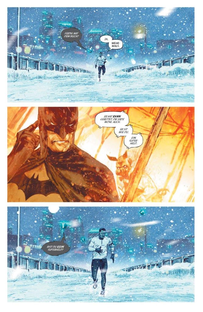 Der Flow der Story entwickelt gleich seinen Sog, weil Leser:innen quasi direkt die Perspektive der Fans und von Adam übernimmt und einen direkt ansieht und anspricht. Die Weltenwechsel hat man schnell drauf. Und so nach und nach erschließt sich auch die Handlung, ohne dass man zu sehr mit der Vorgeschichte vertraut ist. Allein, Tom Kings Story ist komplex und wird auf mehreren Ebenen entwickelt, so dass die kompetente Einleitung von Christian Endres durchaus hilfreich ist und den Lesespaß deutlich erhöht.