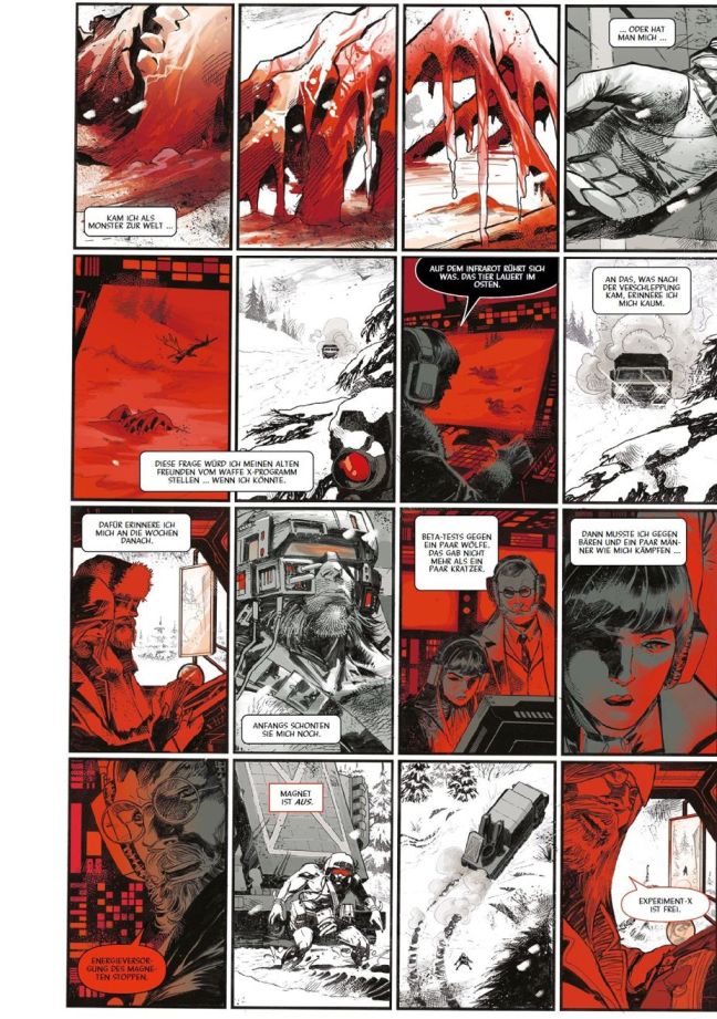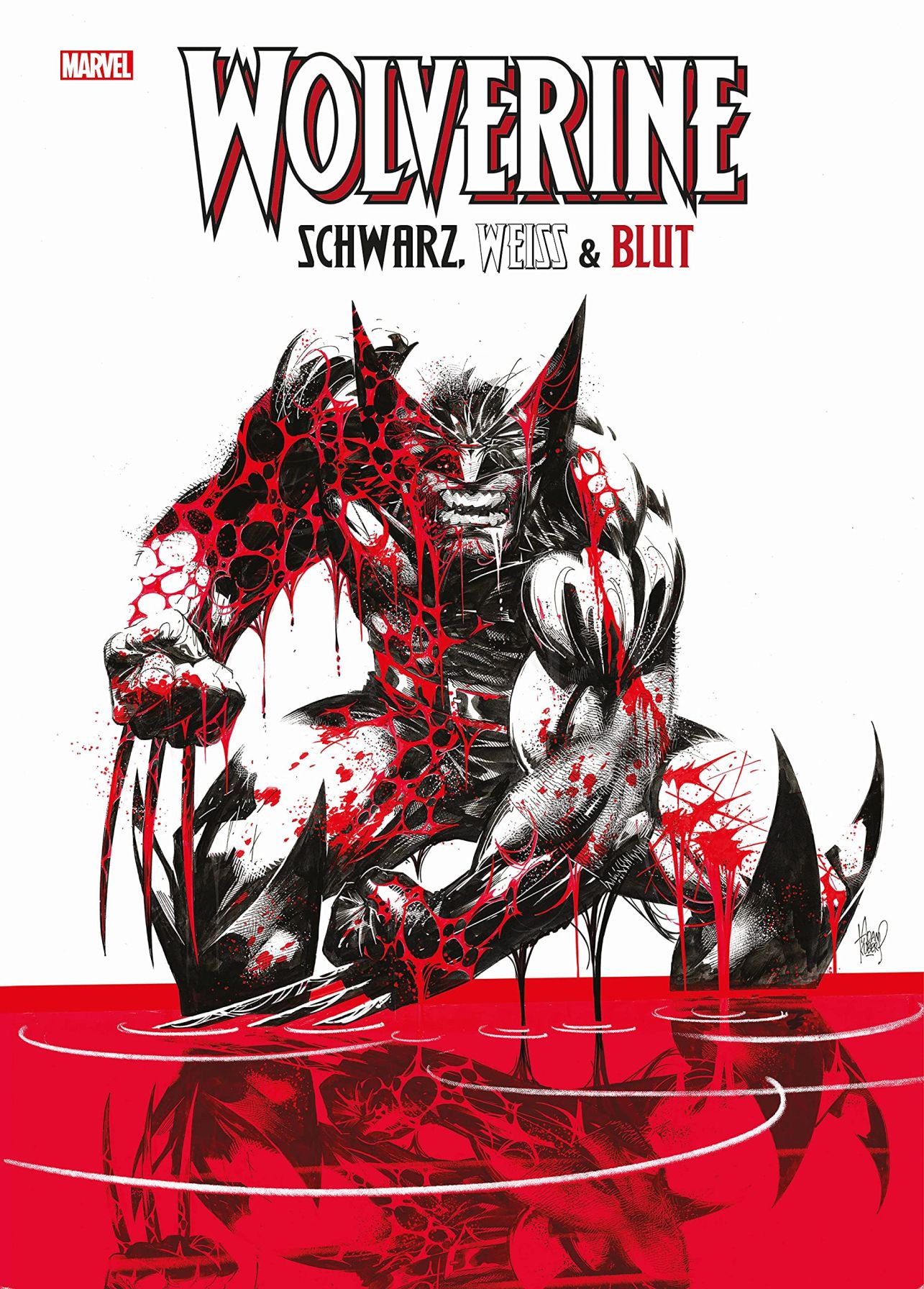 „Wolverine: Schwarz, Weiß & Blut“ wurde als Miniserie von Kurzgeschichten konzipiert und kam in den USA gerade erst im Frühjahr auf den Markt. In vier US-Ausgaben wurden pro Ausgabe jeweils drei Short Stories aus der Wolverine-Mythologie erzählt und in stilvollem Schwarz-Weiß illustriert und mit knalligem Rot aufgepeppt.
