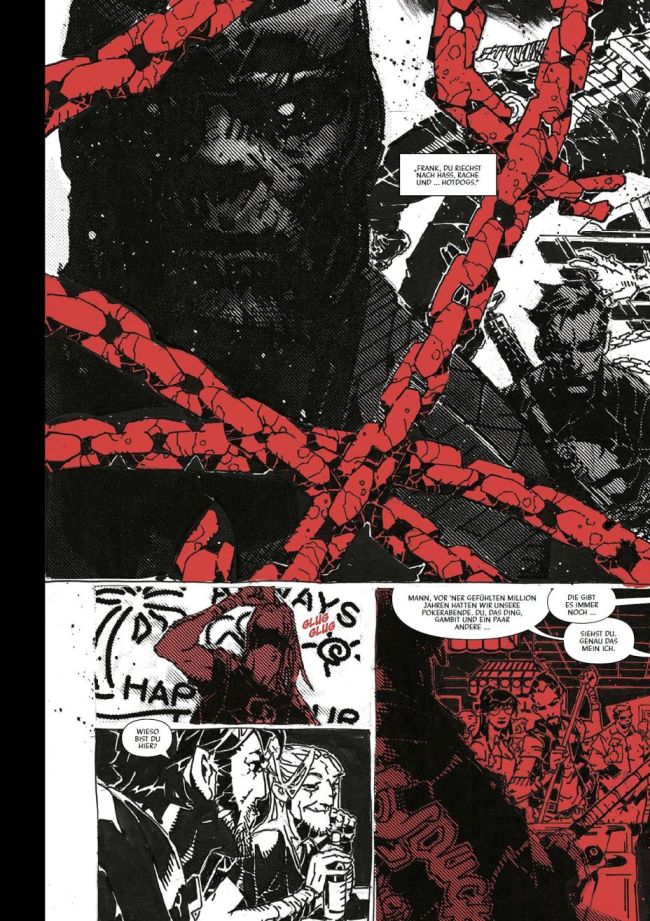 Am Ende sind es die Stories, die von höchst unterschiedlichem Unterhaltungswert sind. Nu je, was sich auf den paar Comic-Seiten an Geschichte entfalten lässt, ist begrenzt, daher bietet die Erzählung jeweils wenig mehr als den Rahmen für die Action. Und die ist stilvoll und in ästhetisierter „Graphic Novel“-Manier in schwarz-Weiß gehalten, wird aber jeweils noch durch blutrote Farbsprengsel.