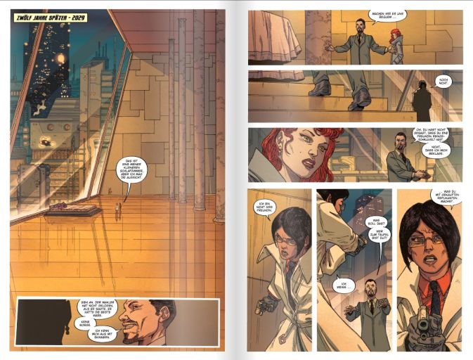 Um es kurz zu machen. Zeichner Andrés Guinaldo und Kolorist Marco Lesco bleiben ihrem klassisch apokalyptischen Look treu und sorgen für eine Düsternis, die der filmischen Vorlage von Ridley Scotts „Blade Runner“-Verfilmung noch immer ausgesprochen nahe steht und die Leser:schaft sofort in die dystopische Zukunft versetzt. Das Artwork hat sich noch nie durch knallige Action-Sequenzen und Splash-Panels ausgezeichnet, sondern durch ruhige Erzählweise und großartige Hintergründe und Setttings.