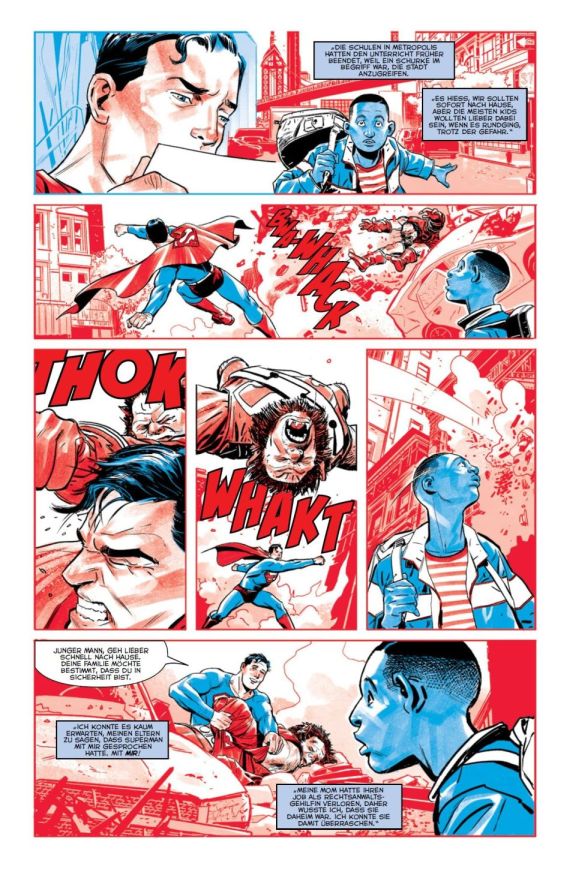 Die farbreduzierten Abenteuer diverser Superhelden haben derzeit einen Lauf. Nach etlichen „Schwarz-Weiß und X“- Abenteuern legt nun auch der Mann aus Stahl nach. Panini Comics veröffentlichte Ende April 2022 die Miniserie „Superman – Rot und Blau“, in der sich insgesamt 30 Kurzgeschichten befinden. Alle spielen mit Farbvarianten und beleuchten diverse Bereiche in Supermans und Clark Kents Leben. Das ist ebenso einsteigerfreundlich wie losgelöst von jeglicher Serien-Chronologie.