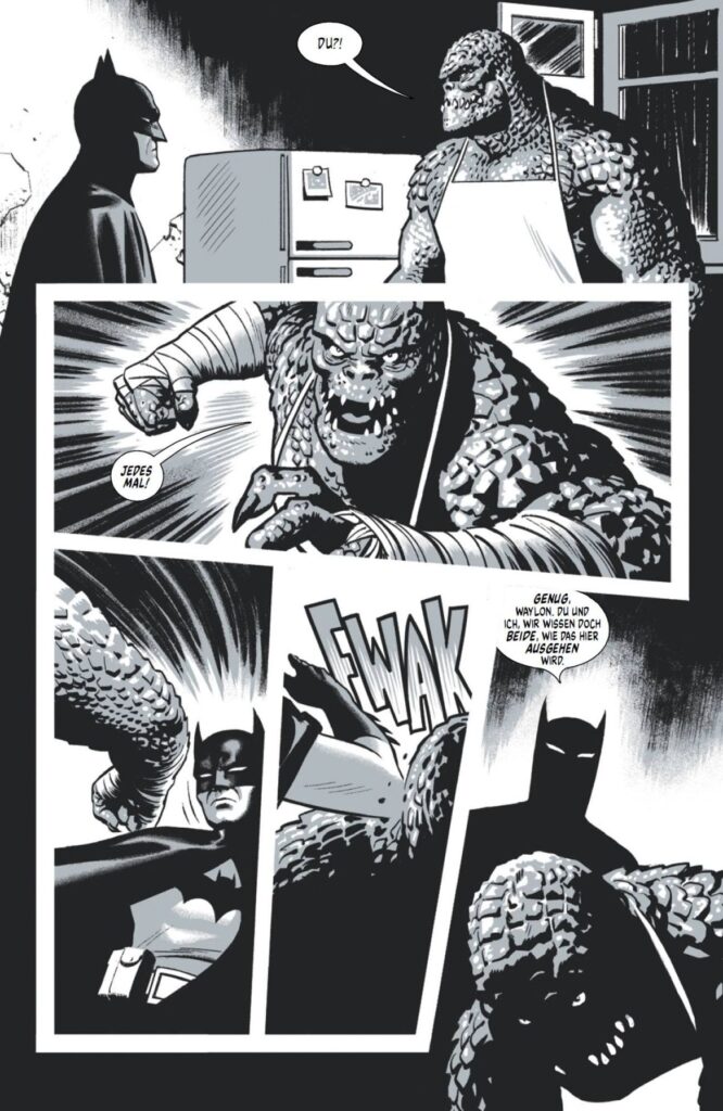 Selbstverständlich ist das alles auch immer Geschmackssache der Leserschaft und nicht jeder kann sich an Dinocroc in der Küche ergötzen oder findet die psychedelische Zeichenkunst von Tradd Moore (ob ohne Farbwirkung oder mit) schön und angemessen. Einigen mag der Graphic Novel-artige statische Seitenaufbau von Mitch Gerards zu langweilig erscheinen, anderen wird Riley Rosmos cartoonartige Collagen Action zu banal und altbacken vorkommen. Verglichen mit den anderen bei brutstatt.de vorgestellten Schwarz-weiß-Sammlungen von „Superman“ oder „Wolverine“ liegt der Batman meilenweit in Führung. Ein Klassiker – mal wieder.