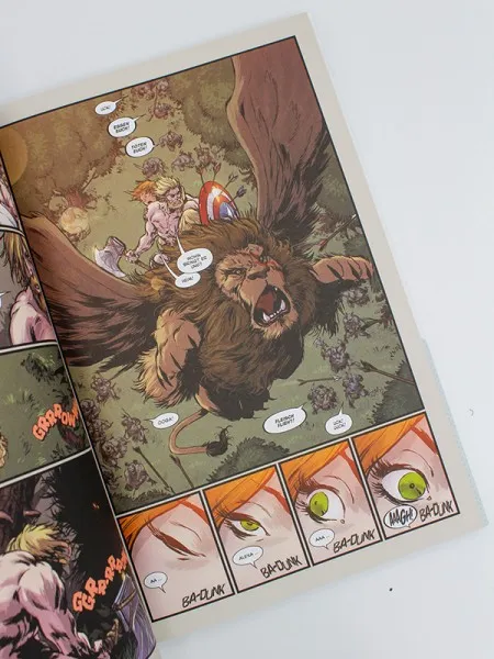 In der Welt, die Andrews für seine 5 US-Ausgaben umfassende abgeschlossene Story entwirft, sind Captain America, Black Widow und Spider-Man gestorben. Alle drei finden sich unabhängig voneinander auf einer mysteriösen Insel wieder. (Fragt mich nicht nach der Temporallogik.) Dort wird der gestrandete Cap von einem Greifen, einer Mischung aus Löwe und Adler, bedroht, der kurz darauf von einem Drachen gegriffen wird. Cap landet in der Folge bei einem Volk, das scheinbar nur aus Frauen besteht, weil die Söhne des lieben Friedens willen bedrohlichen Monstern geopfert werden.