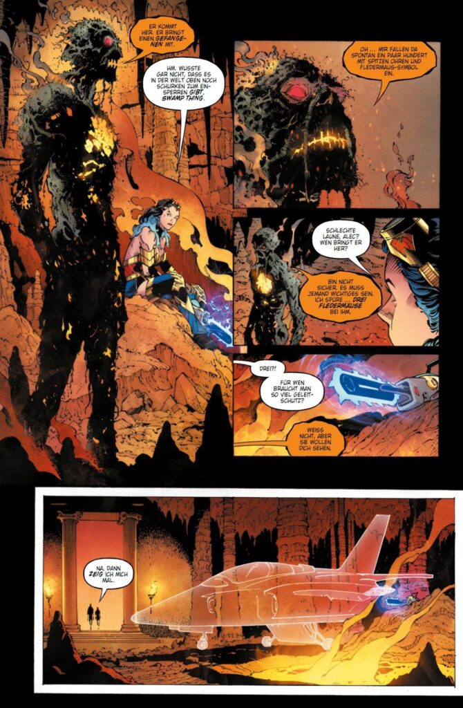 Es muss einen Ansatzpunkt geben. Und den gibt es bei „Batman: Death Metal“ (OT Dark Nights: Death Metal) mit dem Einsetzen der Handlung. Wonder Woman, Diana Prince, ist auf der ehemaligen Amazoneninsel Themyscia damit beschäftigt, Kräfte im Kampf gegen den Batman, der lächelt, zu bündeln, als sich Besuch ankündigt.
