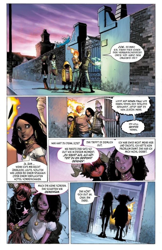 Doyle ist eigentlich ein netter Typ, aber eine Prophezeiung, dass er die Welt vernichtet, macht ihm arg zu schaffen. Die beiden nordischen Göttersöhne Alvi und Iric hatten ihr Abenteuer mit der „Klassenfahrt nach Asgard“. Dessy, Toth, German Gus und Shaylee stehen in diesem Sammelband ebenfalls weniger im Fokus. Allerdings hat ausgerechnet Zoe, die als Voodoo-Zauberin aus New Orleans stammt die undankbare Aufgabe, bei einem Wochenendauslug in die Stadt den Touri-Guide zu spielen.