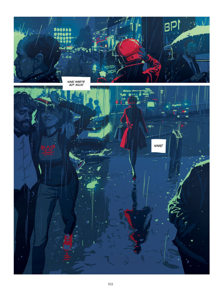 Auch das futuristische Setting, dass die Stilistik von Jaouen Salaün so hinreißend heraushebt, führt letztlich inhaltlich in eine Sackgasse. Stattdessen werden in „Asphalt Blues“ die Lebenswege von Nina und Mick, die mal ein Paar waren, Jahre Später parallel montiert und ausformuliert. Vielleicht allerdings sind die Autos in „Asphalt Blues“ Ausdruck der Nostalgie, Symbole des Verlustes und Sehnsuchtsorte?