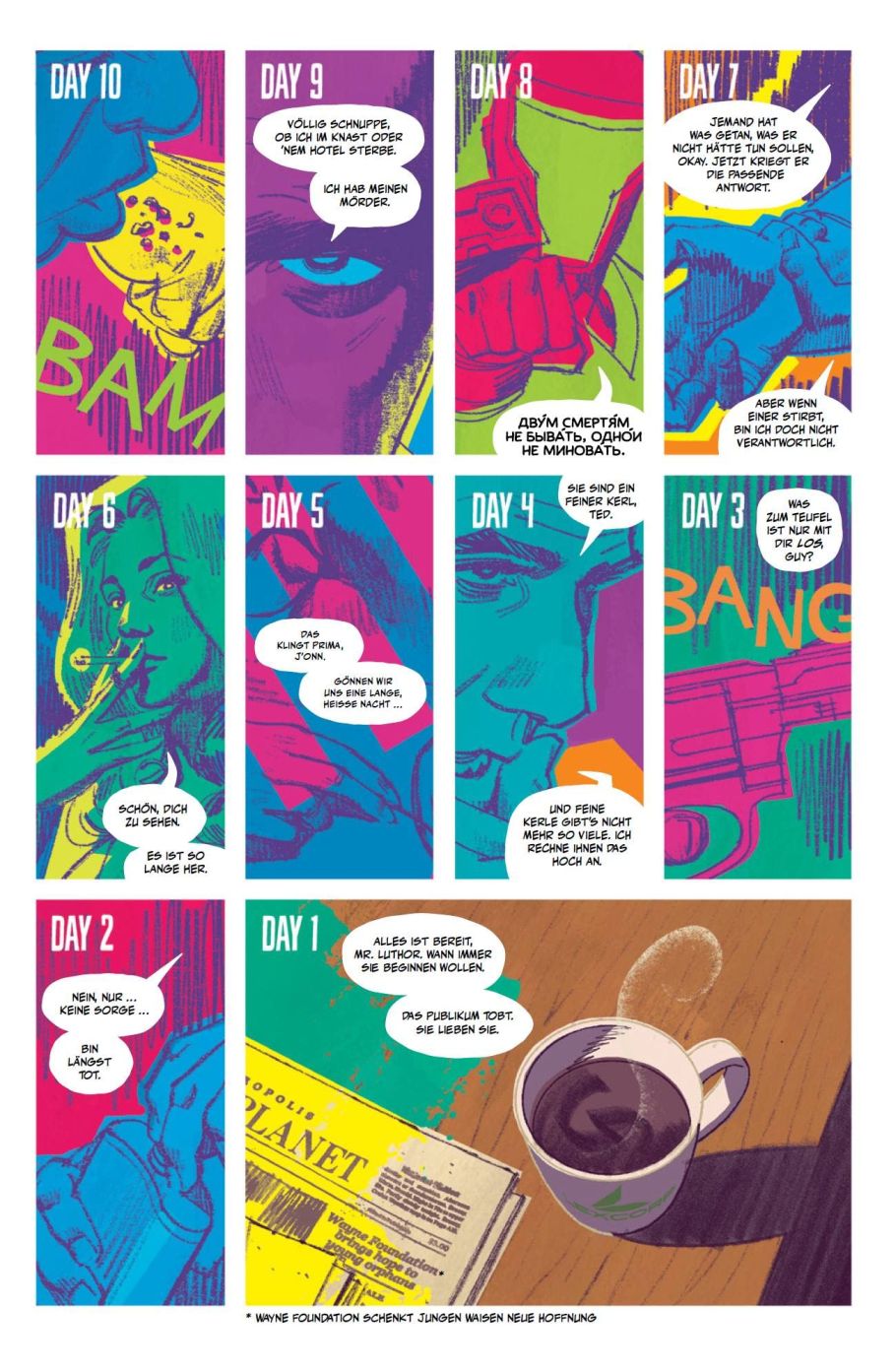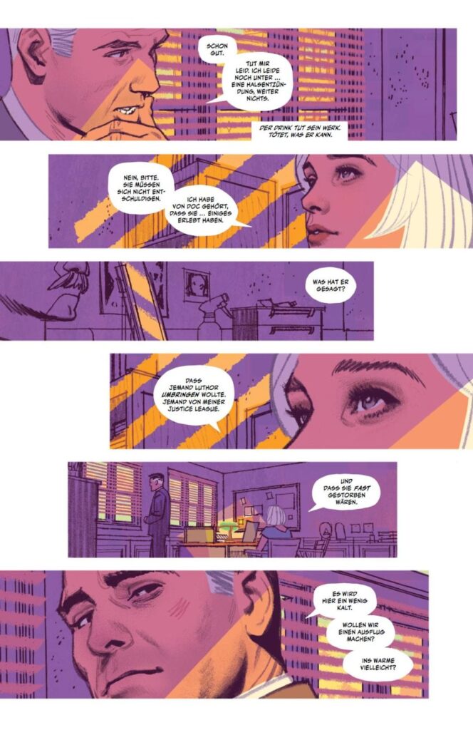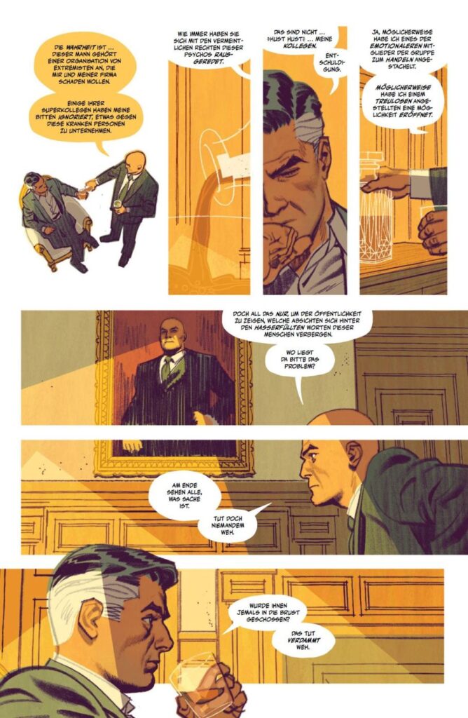 Die Geschichte ist wie für Tom King üblich vertrackt, nicht auf den ersten Eindruck zu überblicken und hat einige erzählerische Kniffe zu bieten. So wird „Human Target“ vom vermeintlichen Todestag aus als Rückschau erzählt. Dabei kommen die Infos für die Leserschaft immer auch häppchenweise, so dass eine gewisse Grundspannung erhalten bleibt. Das ist weniger actionlastig als vielmehr sehr „erwachsen“ erzählt und appelliert an die detektivische Neugier.