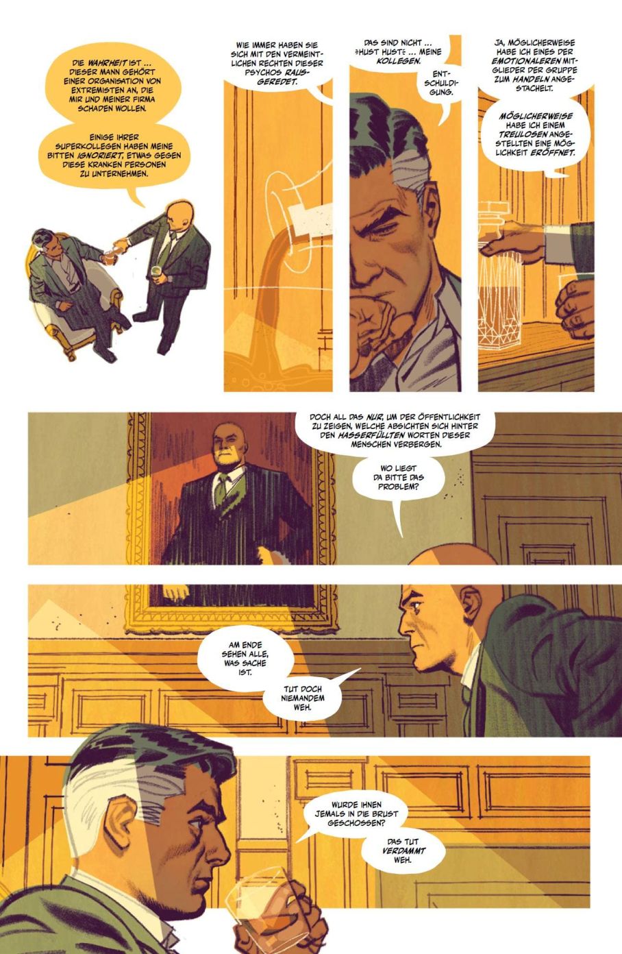 Es kommen farbige Schraffuren und getuschte Hintergründe zum Einsatz. Insgesamt sorgt der somit weicher wirkende Stil dafür, das „Human Target“ zwar zeitlos und klassisch wirkt, aber eben auch nicht superheldenhaft, sondern eher wie eine nivauvolle Graphic Novel für Erwachsene. Was in gewisser Weise der Fall ist.