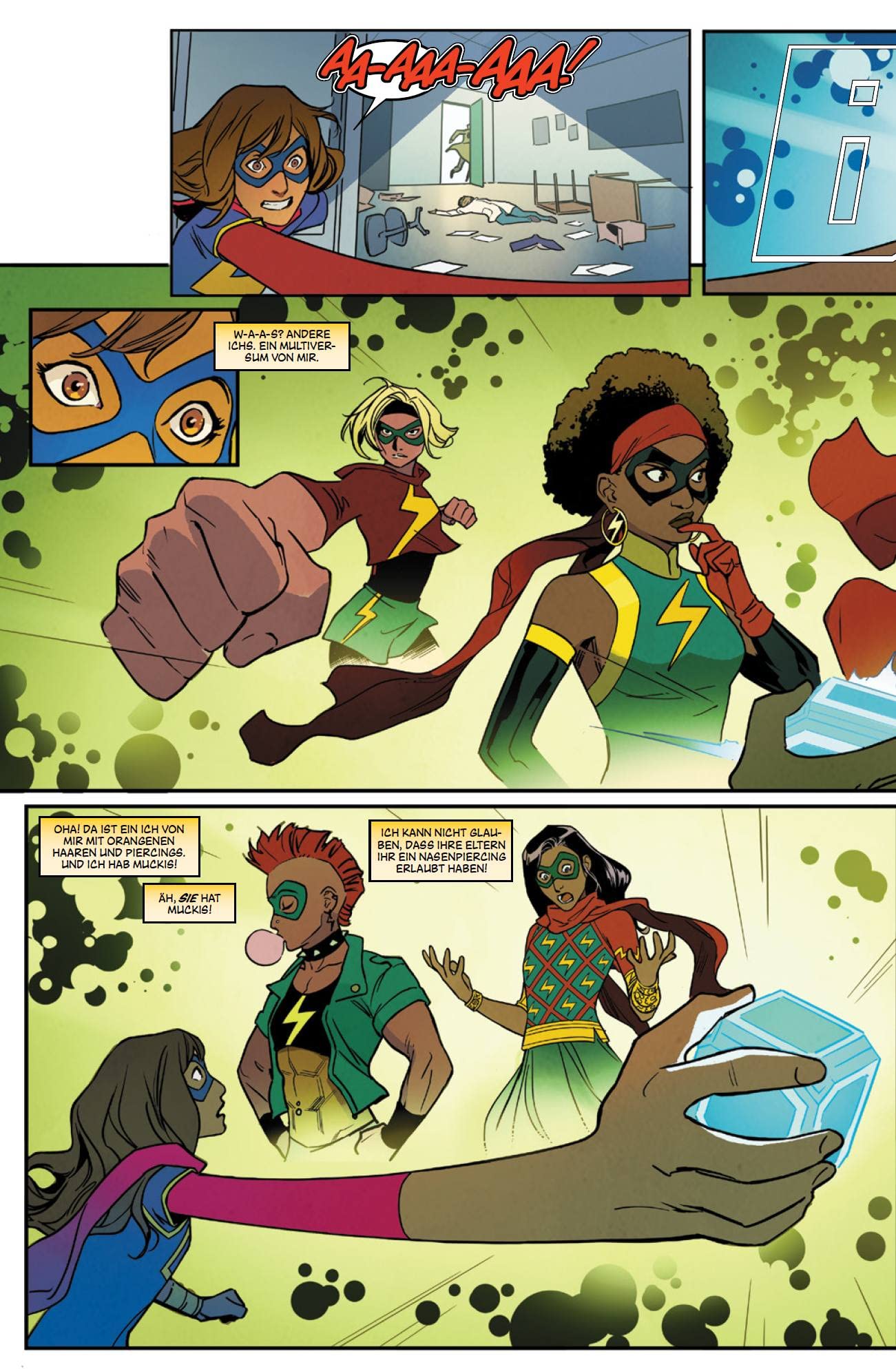 Ms Marvel macht sich so ihren Reim auf die Ereignisse und kommt zu dem Schluss, dass Inkarnationen ihrer selbst aus Parallelwelten hierher übergewechselt sind. Nur, wie behebt die Heldin da Problem wieder?