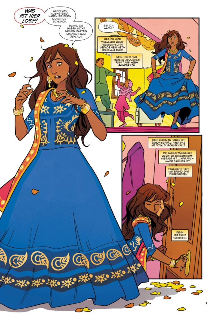 Auf jeden Fall findet sich Kamala, nachdem sie wieder in New Jersey ist, am nächsten Tag in einen Bollywood-Film wieder. Ihre ganze Nachbarschaft singt und tanzt und läuft in wallenden Kleidern durch die Gegend. Dann wird Kamala auch noch Zeugin, als eine andere Ms. Marvel Menschen vor einem Unfall beschützt. Kamala wird sogar selbst gerettet.